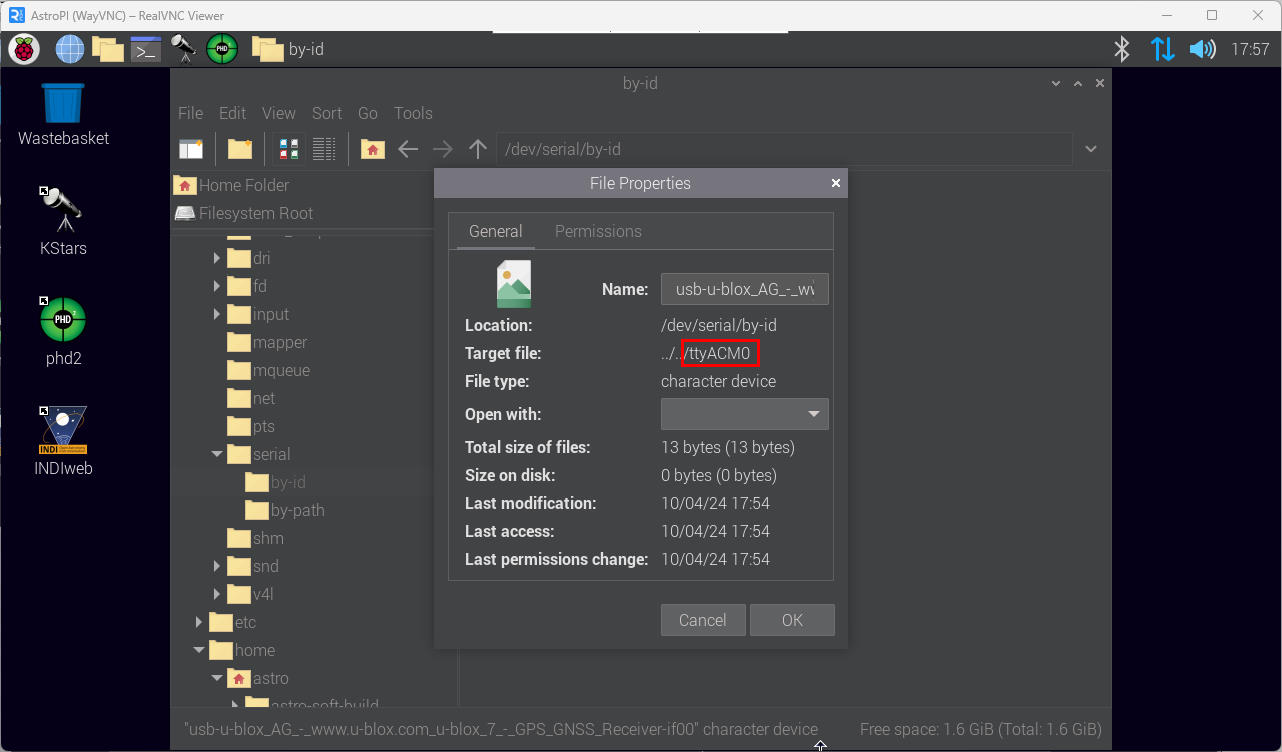Alternativ funktioniert dies auch grafisch über den Dateimanager /dev/serial/by-id/ das Gerät, welches in der Bezeichnung irgendwas mit "u-blox" enthält, als bspw. "usb-u-blox_AG_-_www.u-blox.com_u-blox_7_-_GPS_GNSS_Receiver-if00" mit der rechten Maustaste anklicken und auf Eigenschaften klicken. Dort steht unter Zielname dann ebenfalls ../../ttyACM0