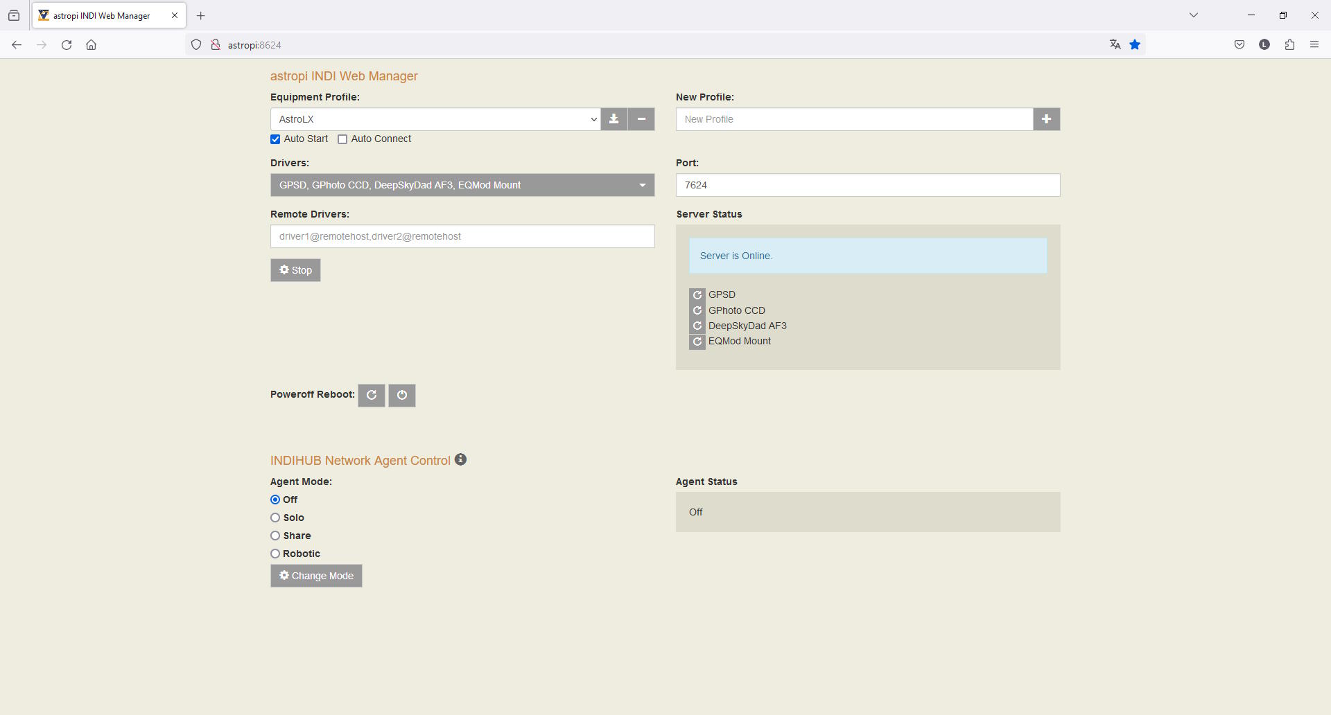 Ab sofort ist der INDI Web Manager im lokalen Netzwerk in einem Browser deiner Wahl über die URL http://astropi:8624 oder direkt am Raspberri über http://localhost:8624 aufrufbar und der INDI Server kann konfiguriert werden.