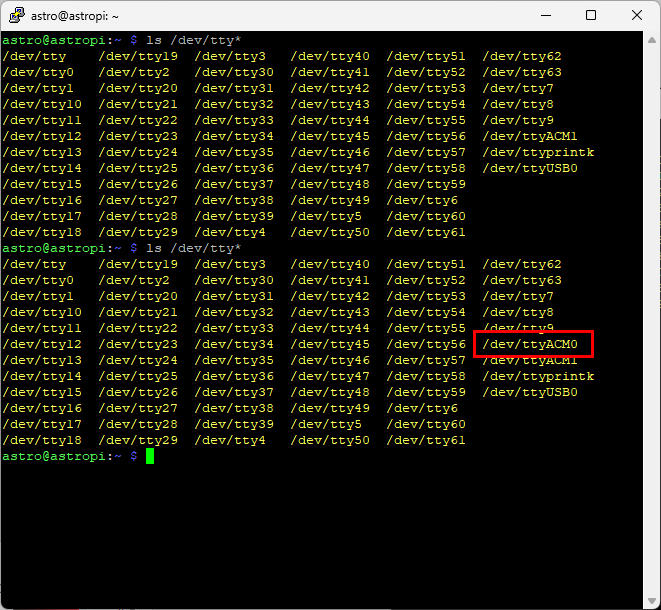 Nun ist ein Gerät dazugekommen, bspw. ttyACM0. Dies ist dann der Dongle, diesen Wert merken wir uns für die weiteren Schritte.