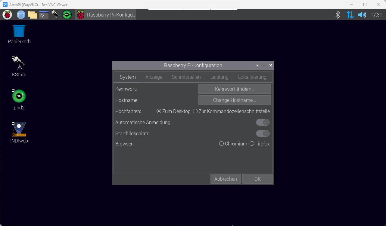 Im Tab System → "Change Hostname". Hier den Hostnamen auf astropi ändern.