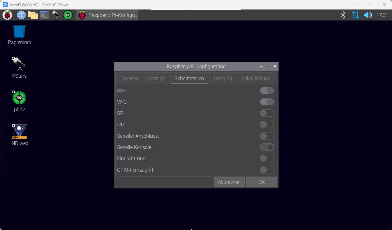 Im Tab Schnittstellen "SSH" und "VNC" für den Remotezugriff aktivieren